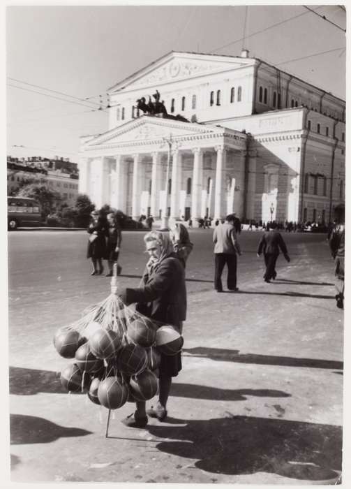 [Woman selling rubber balls for the city's 800th anniversary celebrations in front of the Bolshoi Theatre, Moscow]