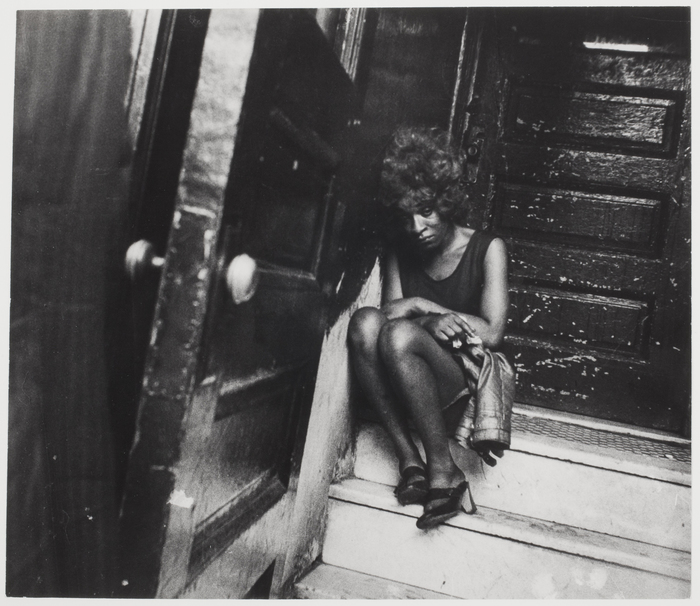 [Woman sitting on stairs, 8th Avenue and 40th Street, Times Square, New York]