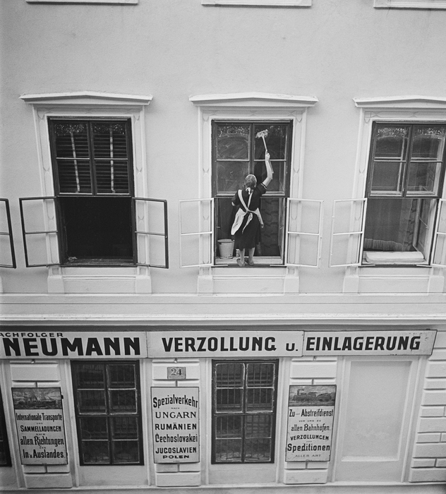 [Woman washing windows above Nachfolger Mandtler & Neumann Speditionen (Mandtler & Neumann Forwarding Agents), Ferdinandstrasse, Leopoldstadt, Vienna]