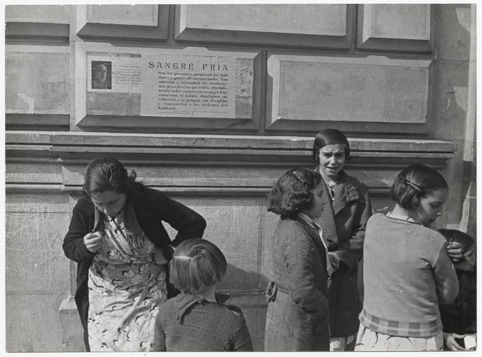 Chim (David Seymour) [Women and children near a poster encouraging "sangre fria" (cold blood) courage, Madrid] Date 1936-37 Location Spain Madrid Dimensions Image (Paper): 6 15/16 x 9 7/16 in. (17.6 x 24 cm) Print medium Photo-Gelatin silver Credit Line Gift of Ben Shneiderman, 2010 Accession No. 2010.103.18