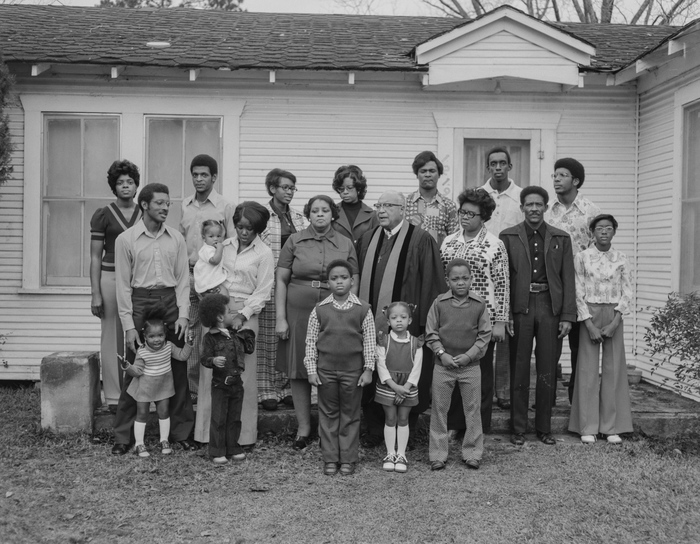 [Women, men, and children gathering with Reverend Levi Lindley in front of his church on Christmas Day]
