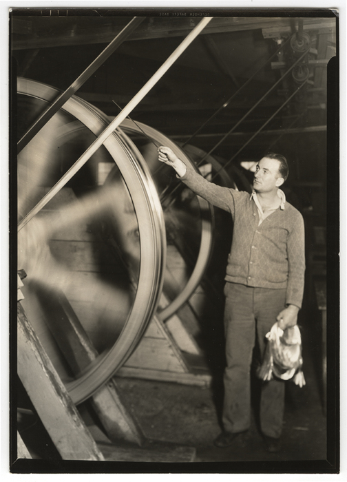 [Worker drawing glass on wheel, Frederick and Dimmock Company, Millville, New Jersey]