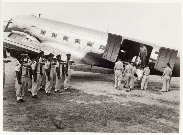 [Wounded French soldiers boarding the airplane during the evacuation operation, Luang Prabang, Laos, Indochina]