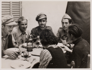 Robert Capa [Soldiers sitting around table with a young woman, Farewell of the International Brigade, near Falset, Spain]
