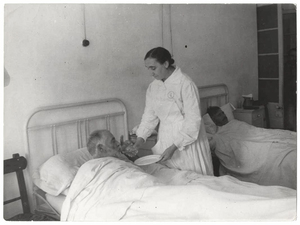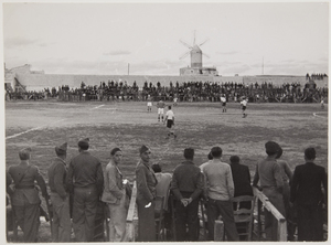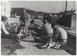 Chim (David Seymour) [Soldier sitting on a stool, surrounded by fishermen who are reparing their nets, Minorca, Spain]