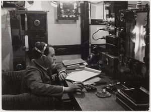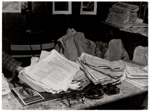 Chim (David Seymour) [Stacks of Spanish Loyalist newspapers and papers, on a desk, telephone in the background, Minorca, Spain]