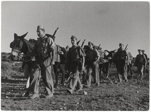 Chim (David Seymour) [Army soldiers walking through a filed with donkeys loaded with gear, Minorca, Spain]