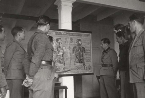 Chim (David Seymour) [Soldiers standing around an illustration of the human digestion, circulation and respitory systems, Minorca, Spain]