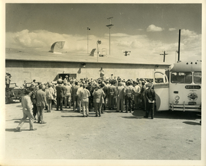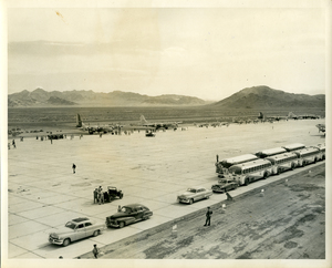 Unidentified Photographer [Overall shot of the press party looking at the display on the ramp of Indian Springs, AFB]