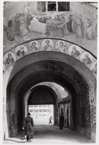 Robert Capa [Man walking through a tunnel covered in elaborate paintings at Holy Trinity Lavra of St. Sergii, Zagorsk, Russia]
