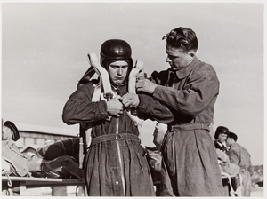 Robert Capa [French air force parachute, Man putting on parachute with second man helping him at Paratrooper school in Avignon-Pujaut, France]