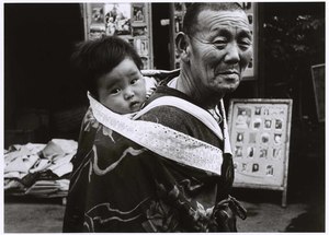 [Old woman carrying a baby on her back in the street, Yaizu, Japan]