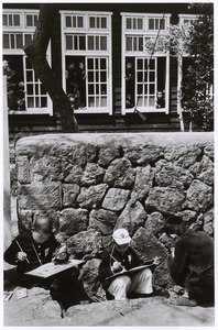 [Children drawing outside close to a stonewall, Yaizu, Japan]