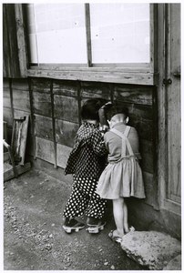 [Children hide their eyes against the wall, Yaizu, Japan]